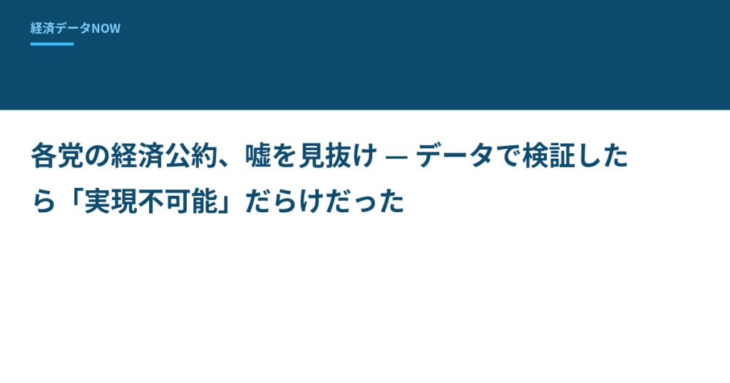 本記事では、主要政党(自由民主党、立憲民主党、日本維新の会、国民民主党、公明党、日本共産党、れいわ新選組)の経済政策公約を、マクロ経済データに基づいて検証する。政策の是非を一方的に断じるのではなく、データとの整合性、財源の裏づけ、実現可能性を客観的に分析することが本記事の目的だ。